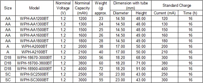 应急照明用高温镍氢电池威普尔高温镍氢电池适用于各种应急安全照明设备,符合IEC61951,UL924,JISC8705,和ICEL1010等国际标准。威普尔高温电池是特别针对应急照明设备而开发的,能承受C/20到C/15的持续充电,并且在高温条件下(至55°C)持续使用达4年时间之久。主要特点:* 优良的高温寿命* 优良的持久充电寿命* 良好的高温充电效率* 符合应急照明行业标准* 良好的储存性能* 免维护镍氢高温电池型号: